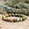 Unakitový náramek vás osvobodí z pasti mysli, podporuje uvědomění Usnadňuje proces začátku – když děláme něco nového, unakit nám pomáhá přijímat informace a dívat se na události a problémy minulosti tak, aby neměly vliv na dnešek Jeho energie posiluje tělo i ducha a osvobozuje vás od špatné energie, povzbuzuje vás, abyste byli protagonisty a účastníky vlastního života, a vyrovnává vaše fyzické, emocionální, mentální a duchovní tělo.